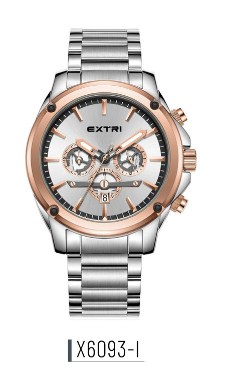 ساعت مچی مردانه برند EXTRI مدل X6093-I با ترکیب رنگ نقرهای و رزگلد، طراحی شیک و مدرنی دارد و برای استفاده روزمره و مجالس بسیار مناسب است. دارای بند استیل ضدزنگ، عقربههای طرحدار و امکانات کرنوگراف. انتخابی عالی برای آقایان خوشسلیقه که به کیفیت و زیبایی اهمیت میدهند.