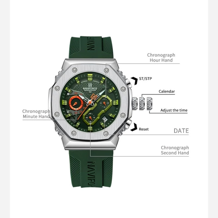 الا اصلی و شرکتی با ضمانت اصالت موتور کوارتز ساخت چین با کیفیت عالی دارای نشانگر تاریخ و کرنوگراف و ساعات شبانه روز شیشه معدنی مقاوم در برابر خش مقاوم در برابر آب (در حد پاشش آب) قطر صفحه : 38 میلیمتر ضخامت ساعت : 12.5 میلیمتر وزن ساعت : 78 گرم به همراه جعبه و پاکت اصلی نیوی فورس