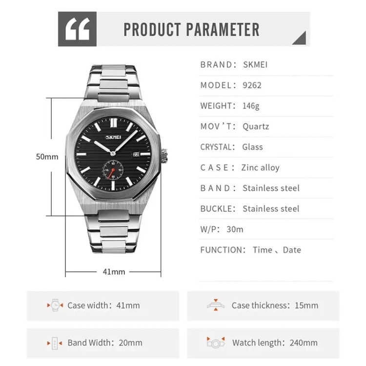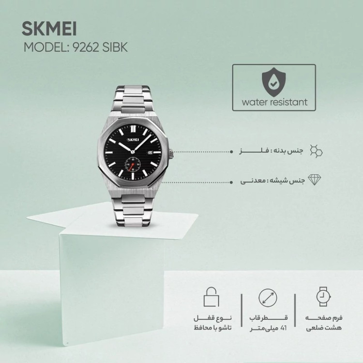 اطلاعات کلی مناسب برای آقایان استایل کاربری روزمره برند اسکمی (SKMEI) ابعاد وزن 146 گرم طول قاب 50 میلیمتر عرض قاب 41 میلیمتر ضخامت قاب 15 میلیمتر طول بند 240 میلیمتر عرض بند 20 میلیمتر مشخصات ظاهری فرم هندسی صفحه دایره نوع صفحه نمایش عقربهای جنس قاب آلیاژ روی جنس درپوش پشتی استیل ضدزنگ جنس شیشه شیشه معدنی جنس بند استیل ضدزنگ نوع قفل بند سه تیکه پروانه ای رنگبندی رنگ قاب نقرهای رنگ بند نقرهای رنگ صفحه مشکی ویژگیها مقاومت در برابر آب تا عمق 30 متر (در حد دست شستن) ویژگی تاریخ شمار, عقربه یا شاخص شبتاب اطلاعات موتور و باطری و برند تکنولوژی موتور کوارتز کد باطری SR626SW عمر باطری 2 سال شرکت سازنده موتور اسکمی (چین)