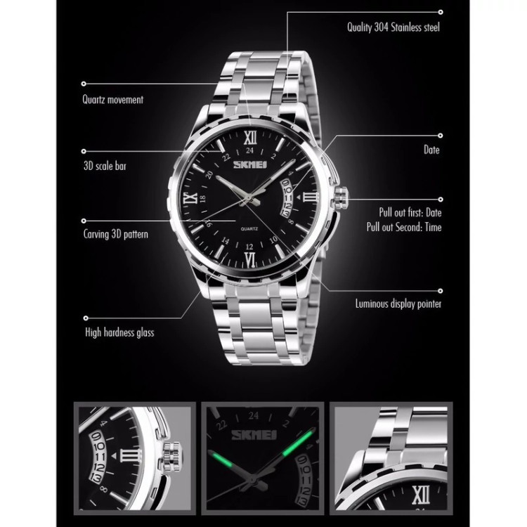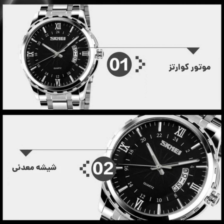 اطلاعات کلی مناسب برای آقایان استایل کاربری روزمره برند اسکمی (SKMEI) ابعاد وزن 135 گرم طول قاب 50 میلیمتر عرض قاب 44میلیمتر ضخامت قاب 14میلیمتر عرض بند 22 میلیمتر طول بند 220 میلیمتر مشخصات ظاهری فرم هندسی صفحه دایره نوع صفحه نمایش عقربهای جنس قاب آلیاژ روی جنس درپوش پشتی استیل ضدزنگ جنس شیشه شیشه معدنی جنس بند استیل ضدزنگ نوع قفل بند دکمه ای تاشو رنگبندی رنگ قاب نقرهای رنگ بند نقرهای رنگ صفحه مشکی ویژگیها مقاومت در برابر آب تا عمق 30 متر (در حد دست شستن) ویژگی تاریخ شمار, عقربه یا شاخص شبتاب اطلاعات موتور و باطری و برند تکنولوژی موتور کوارتز کد باطری SR626SW عمر باطری 2 سال شرکت سازنده موتور اسکمی (چین)